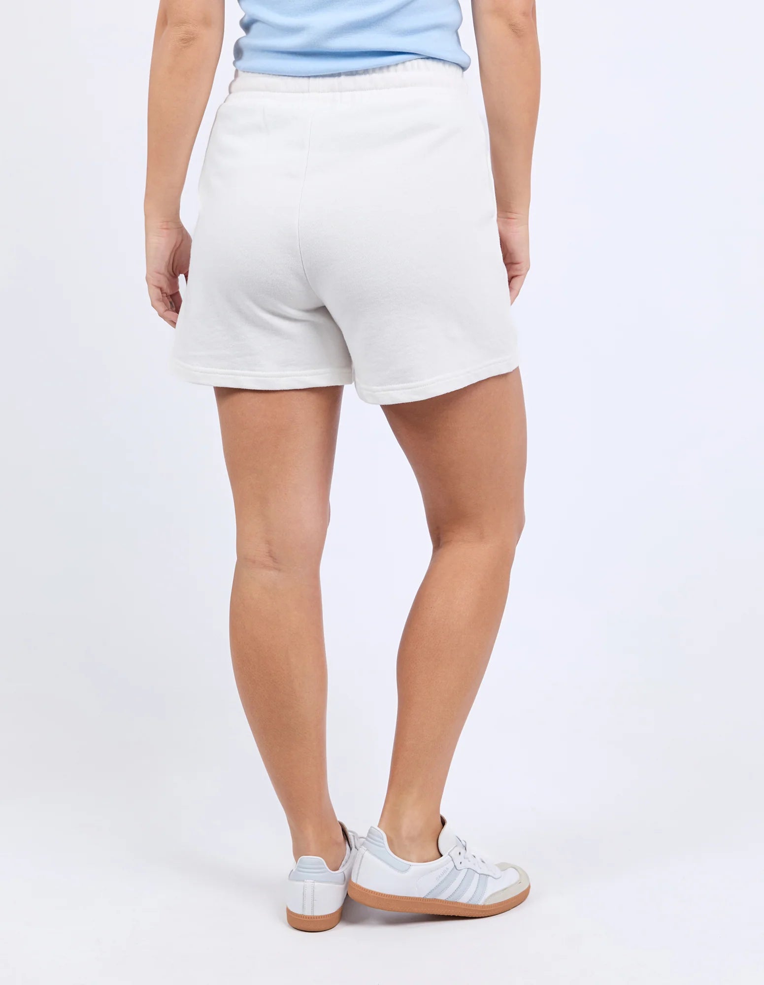 The Simplified Confetti Short featuring in Vintage White with a comfy elastic waistband with contrasting drawcord, side pockets, and bright multicoloured embroidery on the left-hand bottom of front of the short.