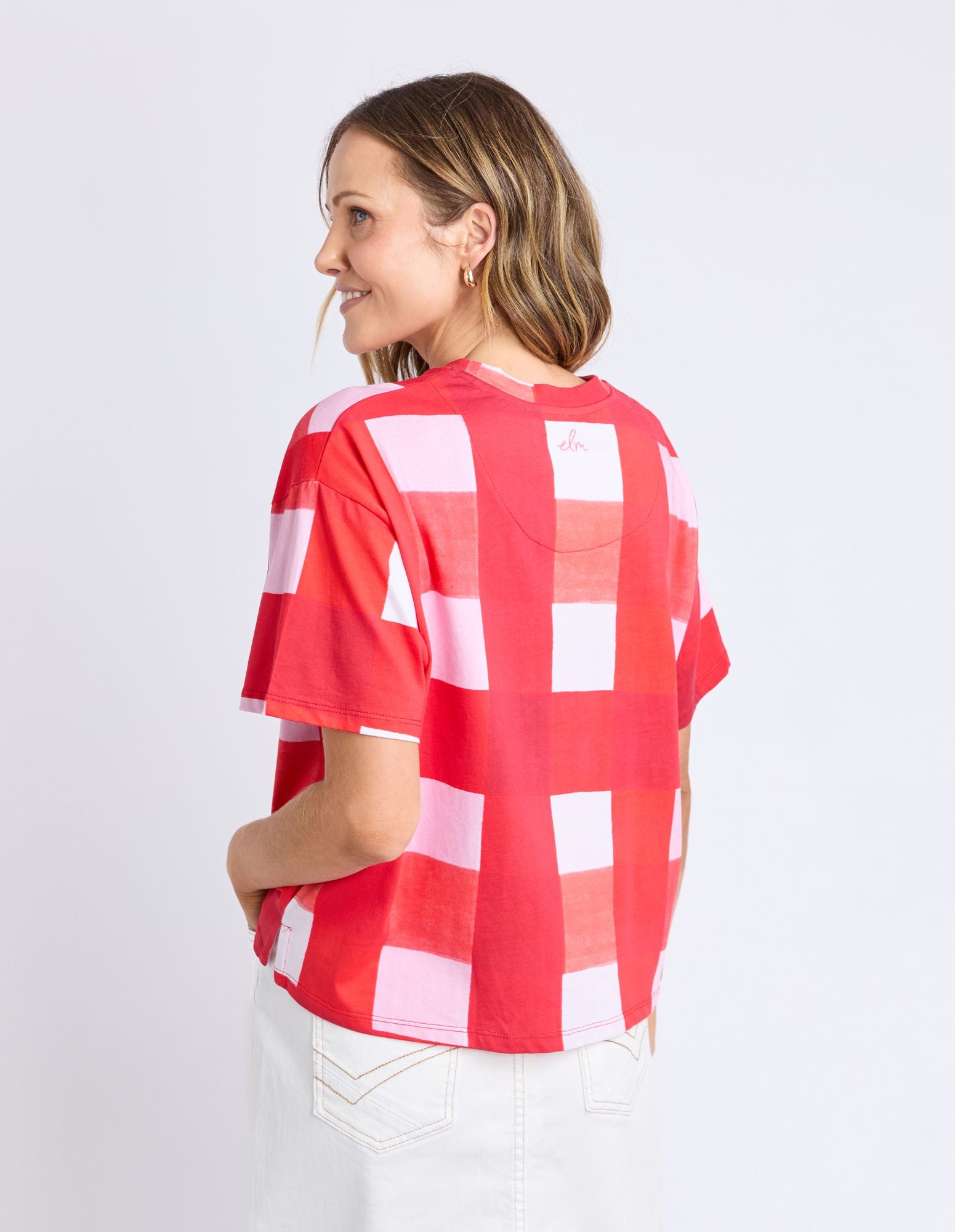 The Edin Tee featuring in Abstract Yardage Print with a round neckline, dropped shoulder, in a relaxed fit with side splits at the base of tee.