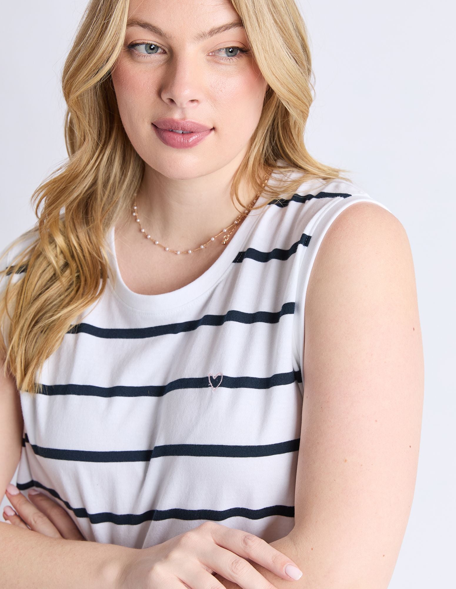 The Halli Tank featuring in White and Navy Stripe with a light pink heart on the front left hand side of bustline with a round neckline in a relaxed fit with the scooped hemline with the back being slightly longer.