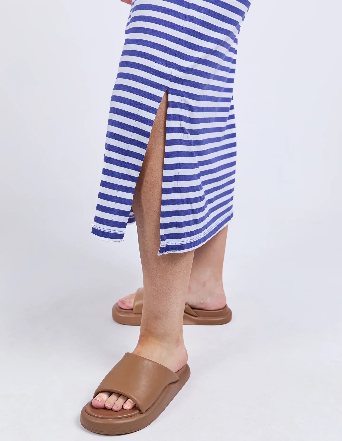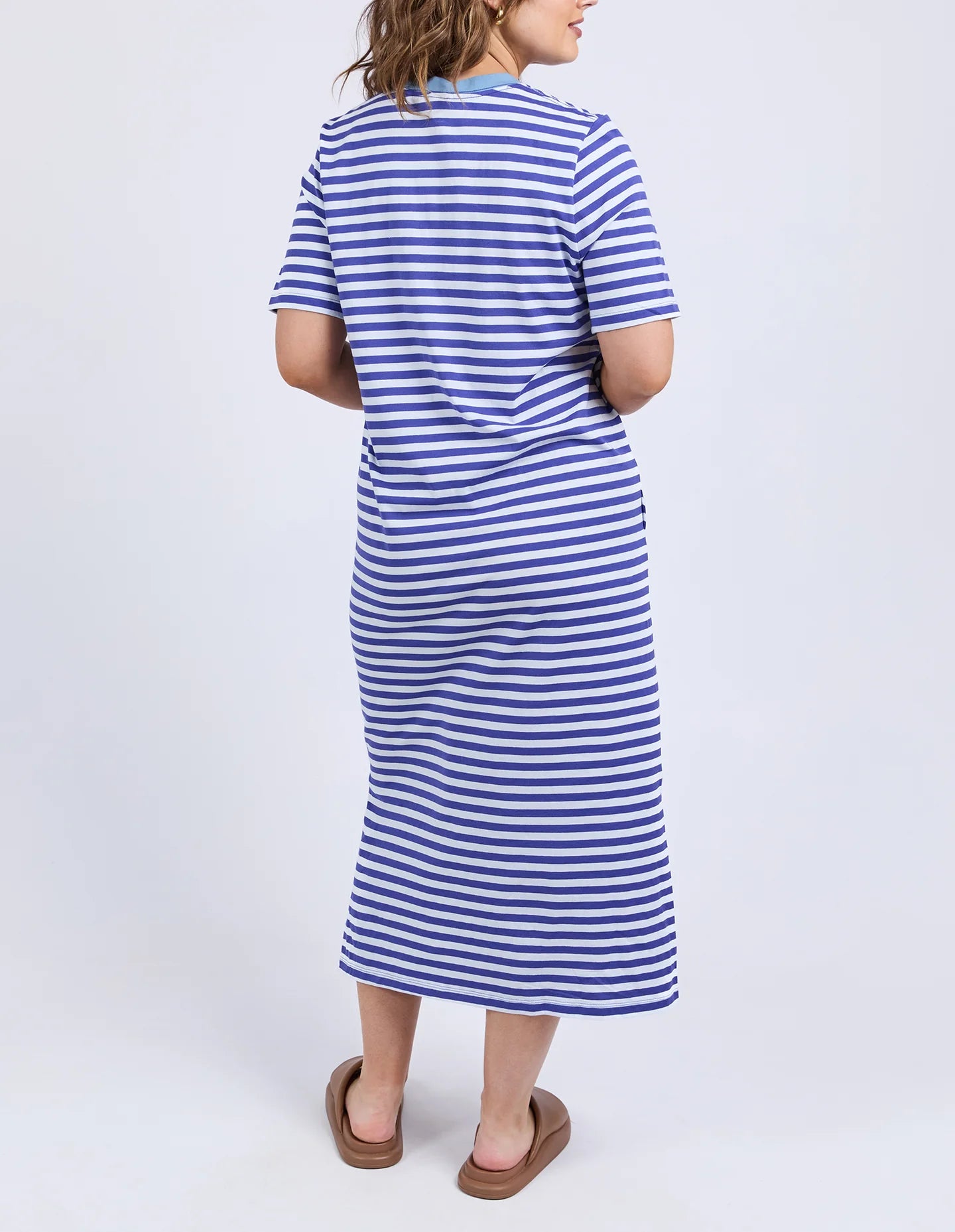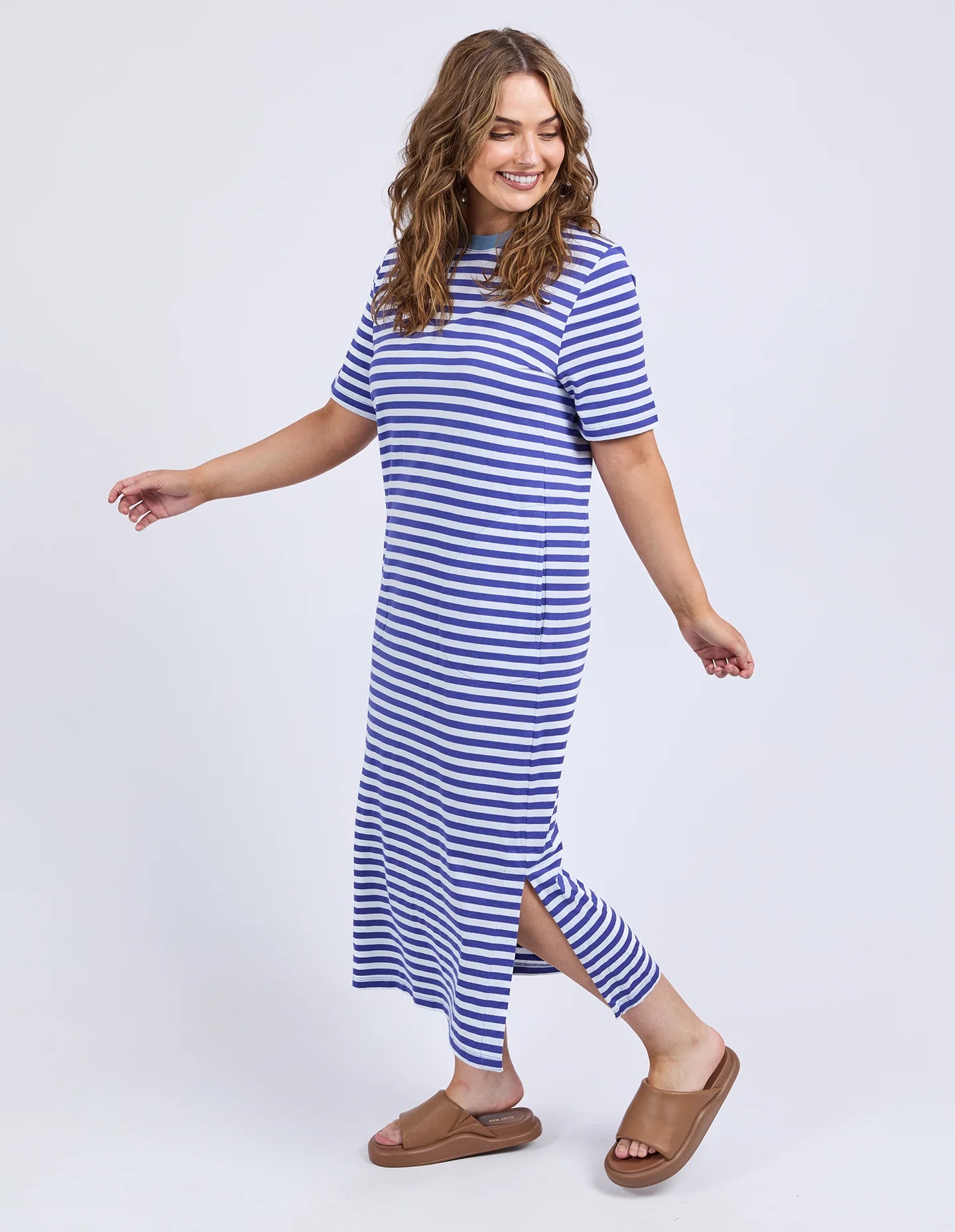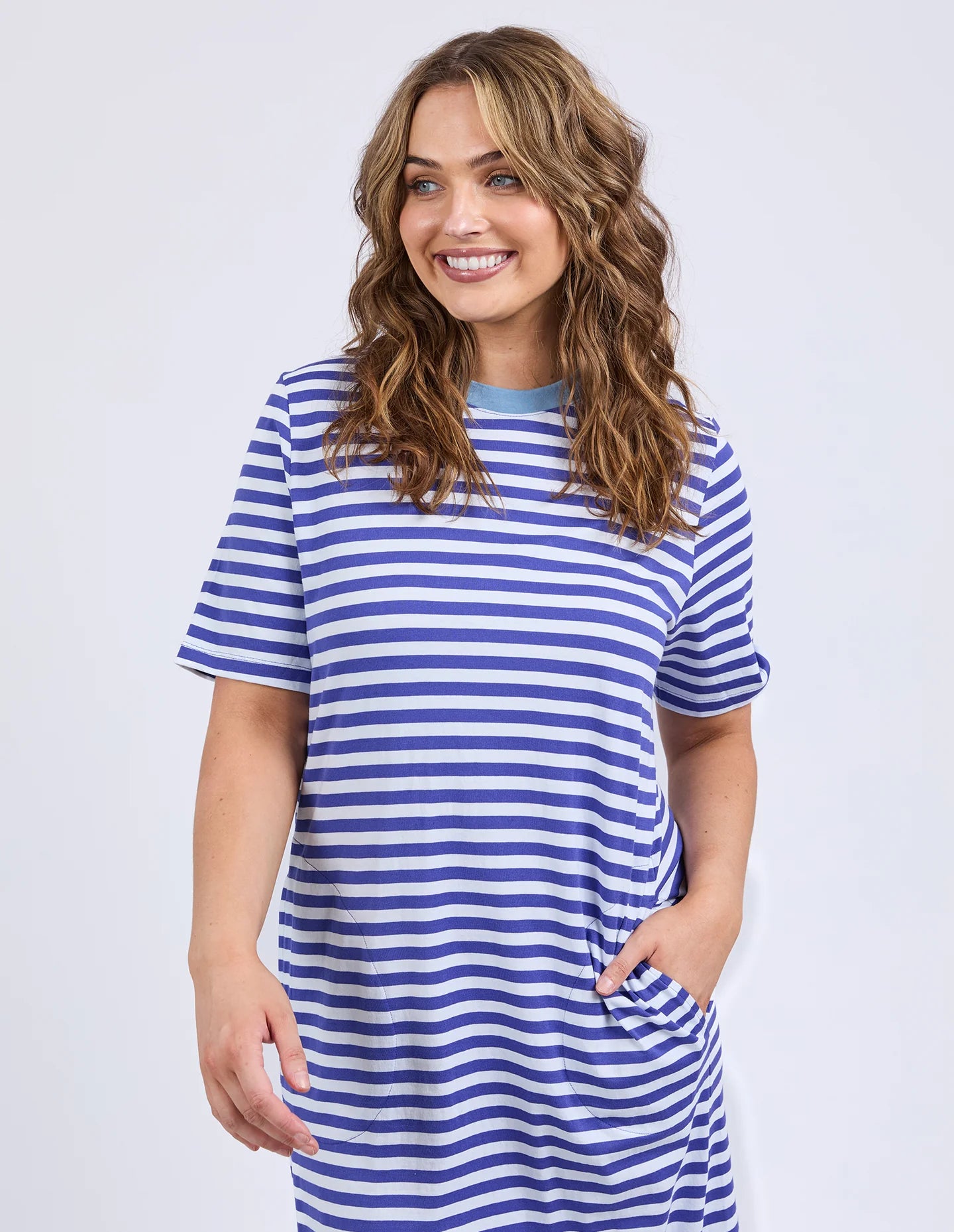 The Merry Tee Dress featuring in White / Ocean Blue Stripe with a round neckline a classic tee dress fit with side splits and side seam pockets.