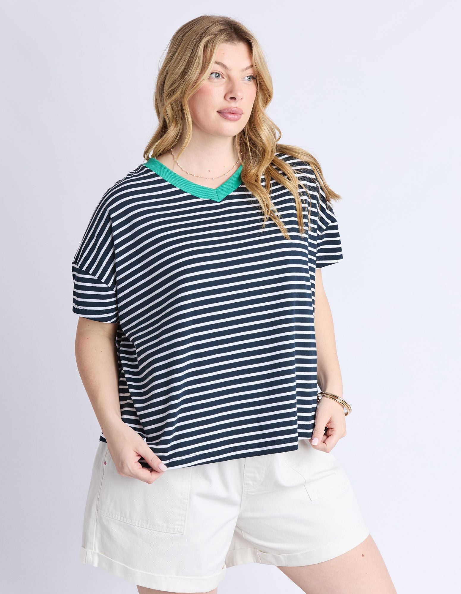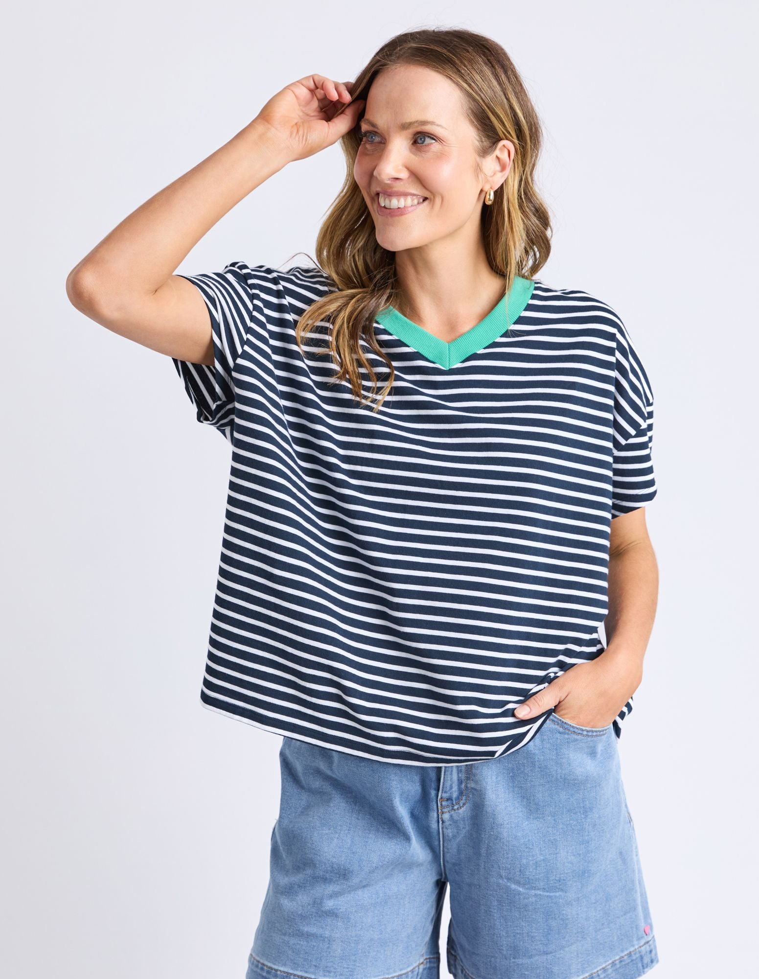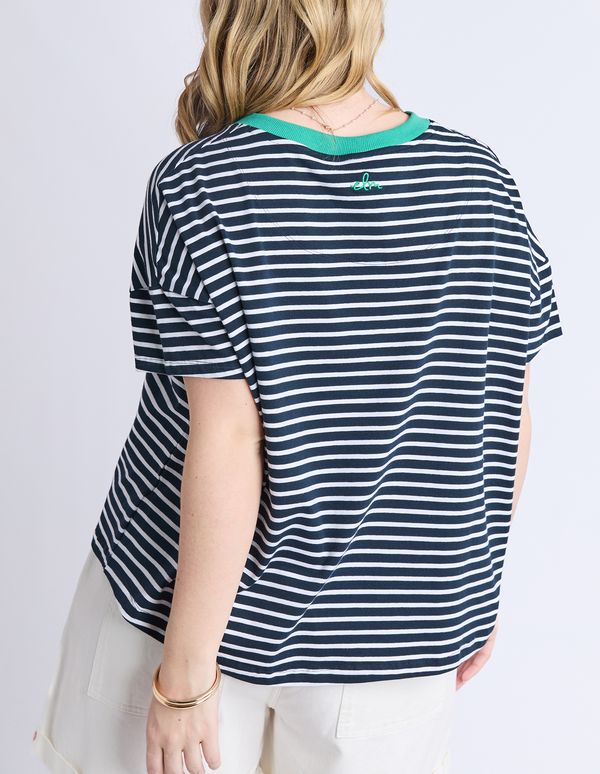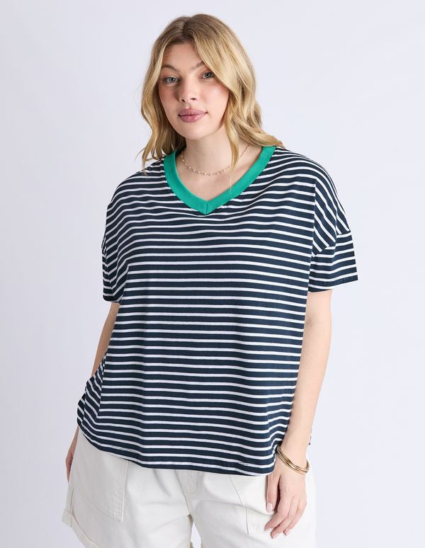 The Sabrina Tee featuring in navy and white stripe with a pop of contrasting colour on the V neckline, in a relaxed fitting.