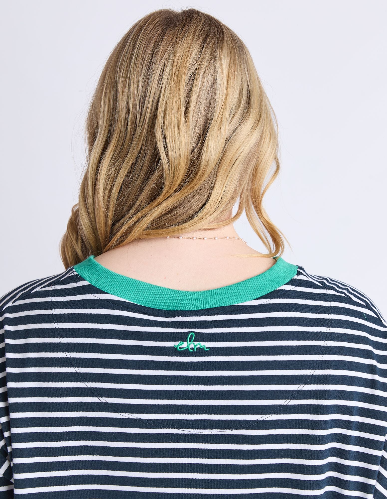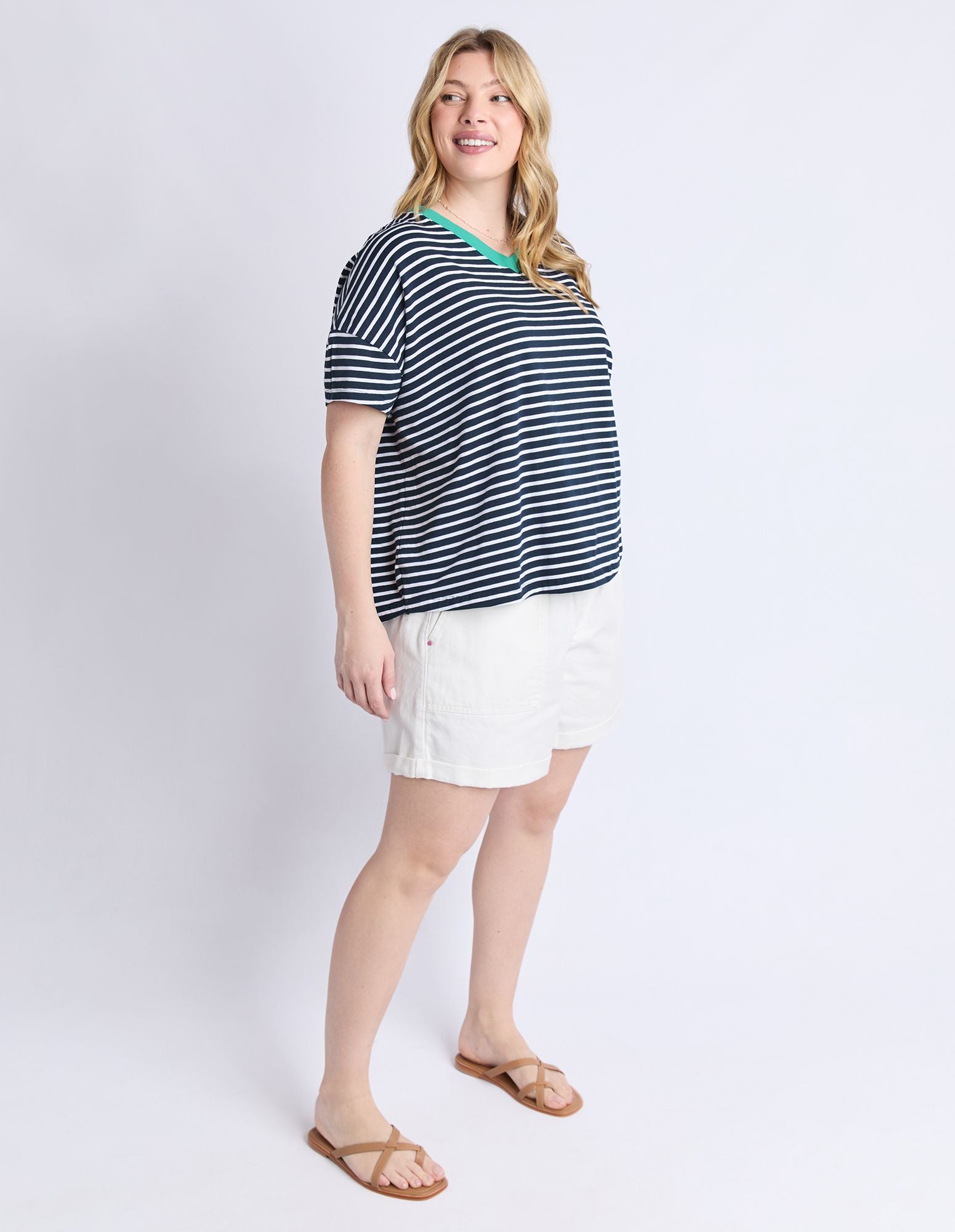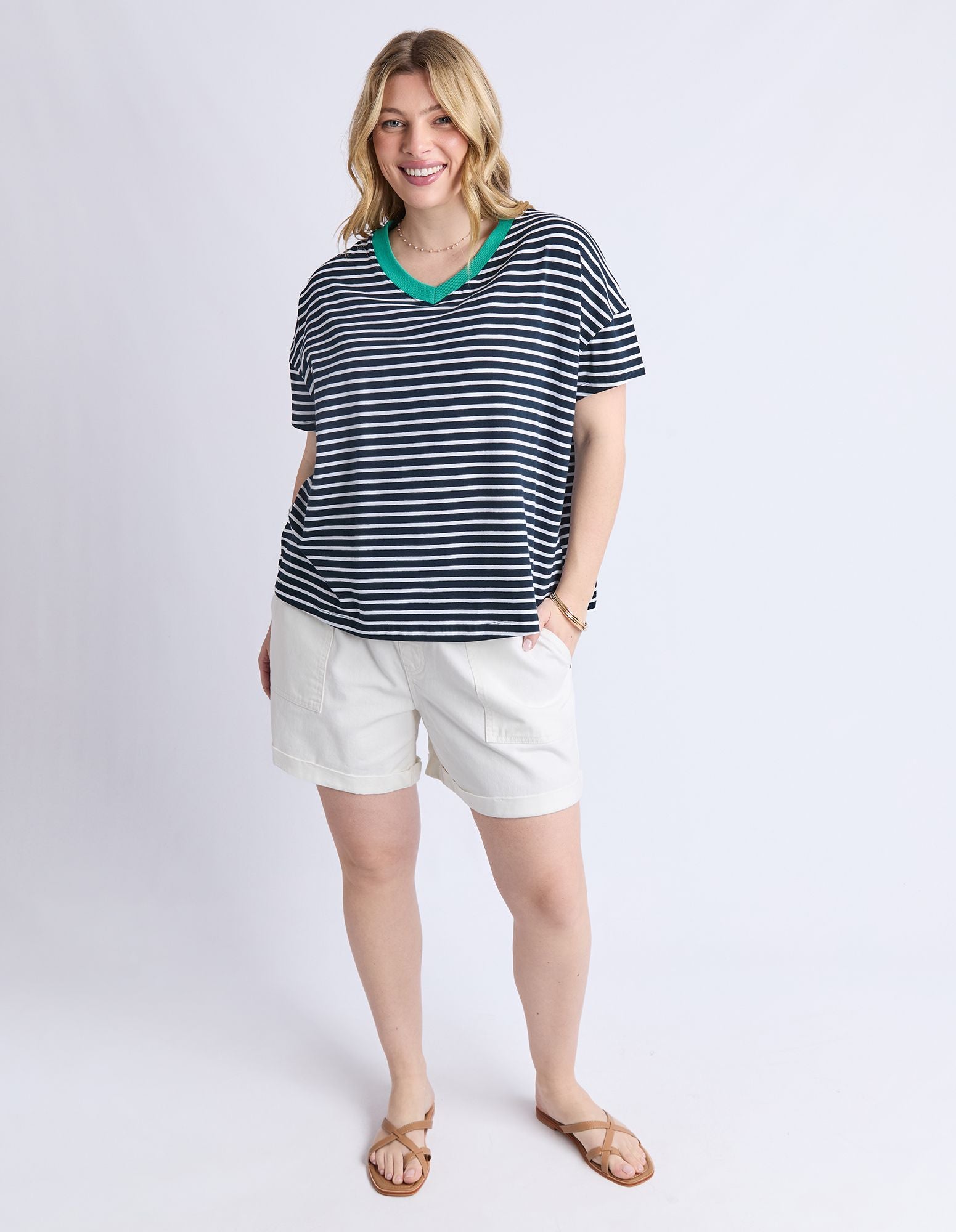 The Sabrina Tee featuring in navy and white stripe with a pop of contrasting colour on the V neckline, in a relaxed fitting.
