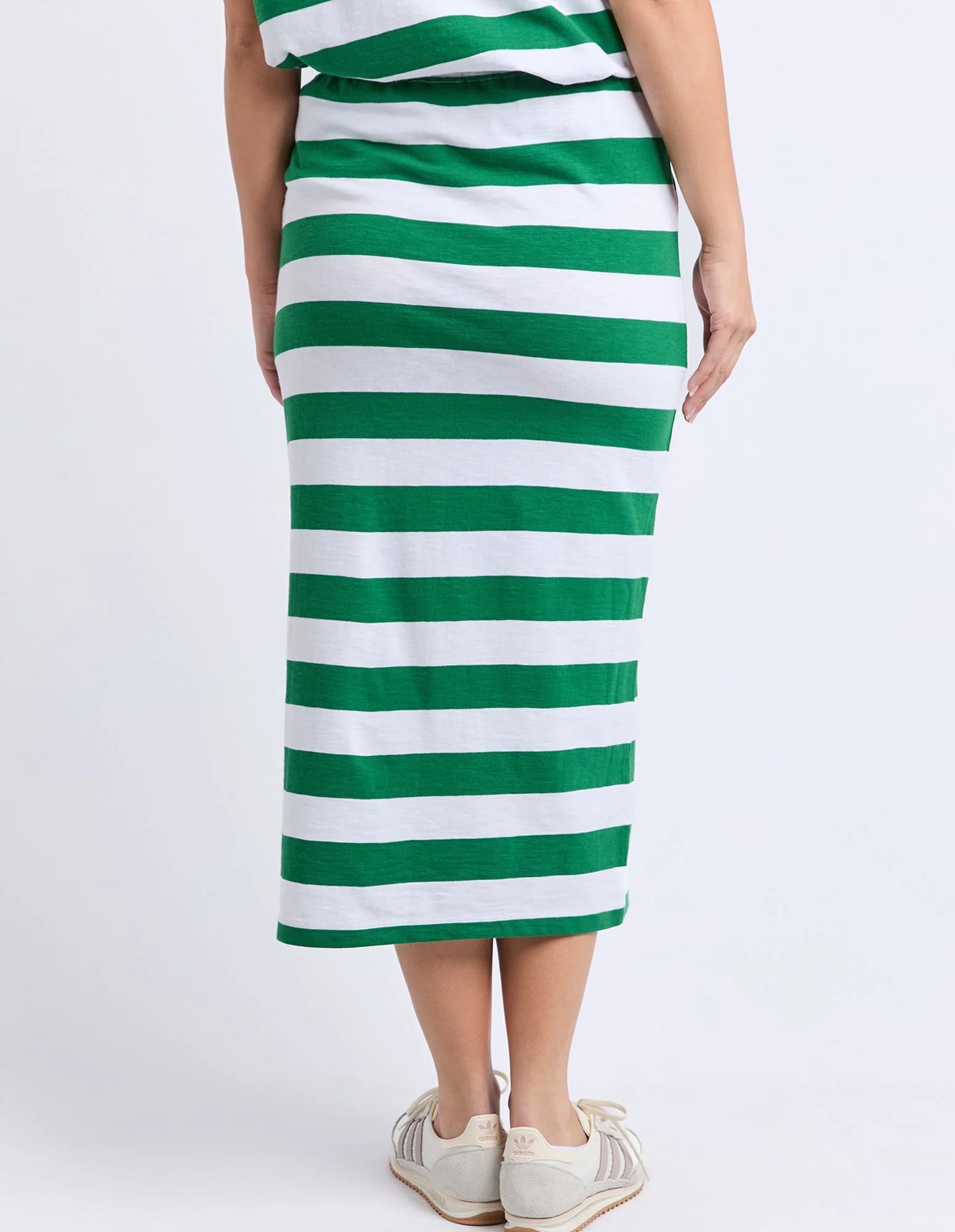 The Tallow Skirt featuring in White/Green Stripe with an elasticated waistband with drawstring, side seam pockets, in a relaxed fitting midi length.