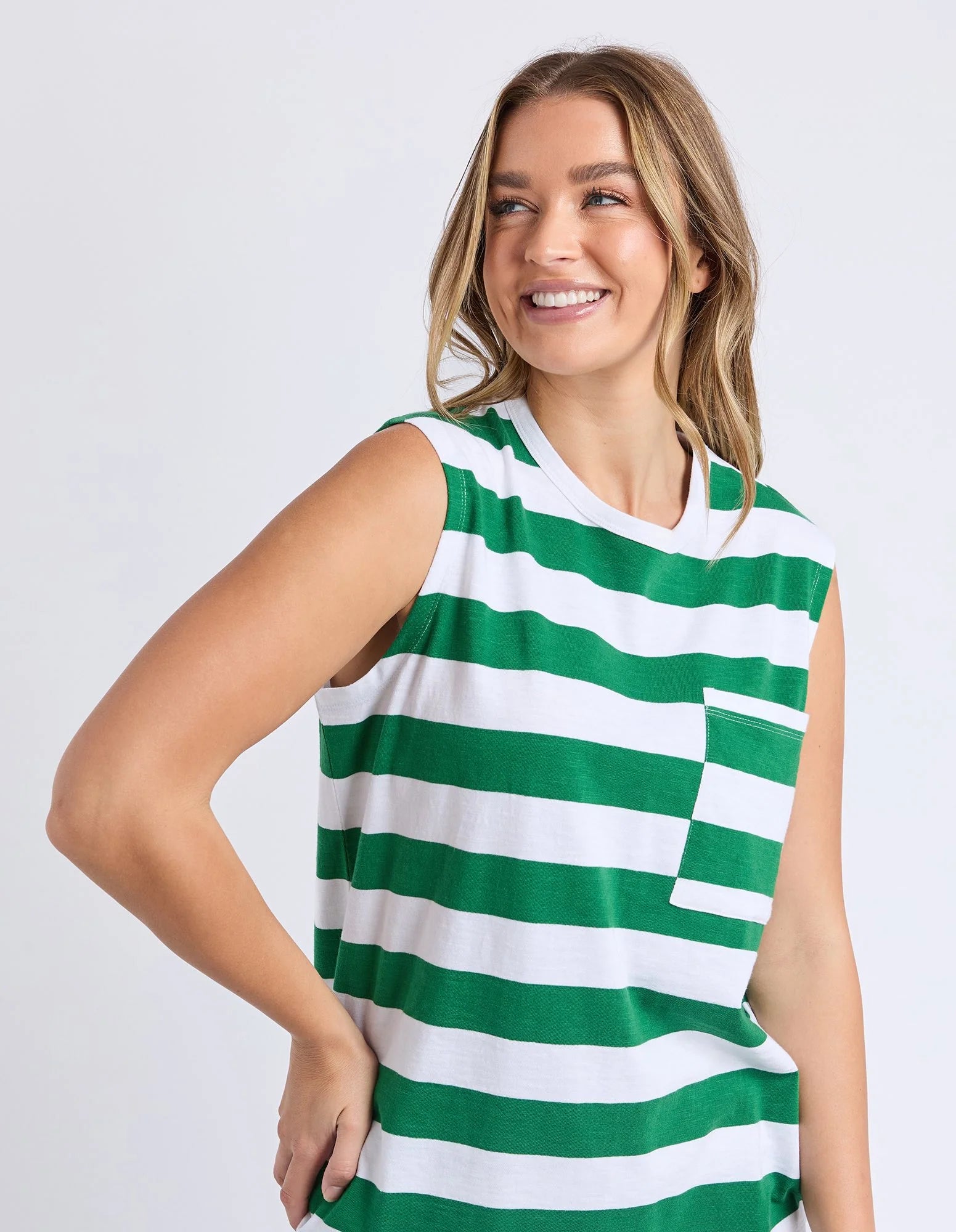 The Tallow Tank featuring in White / Green Stripe with a round neckline, Bold yarn dyed stripe in a relaxed fitting with a front chest...