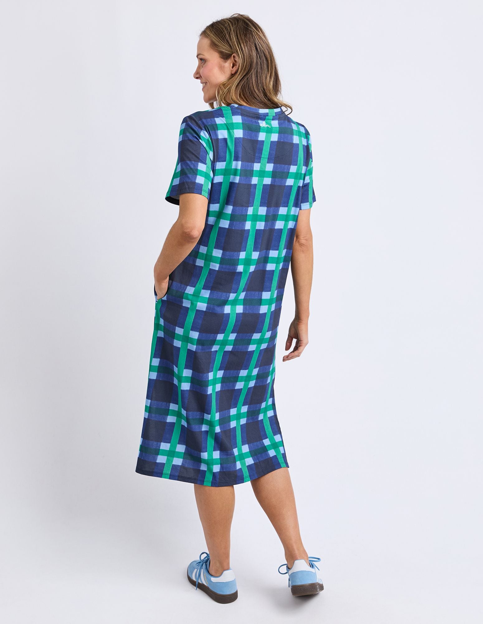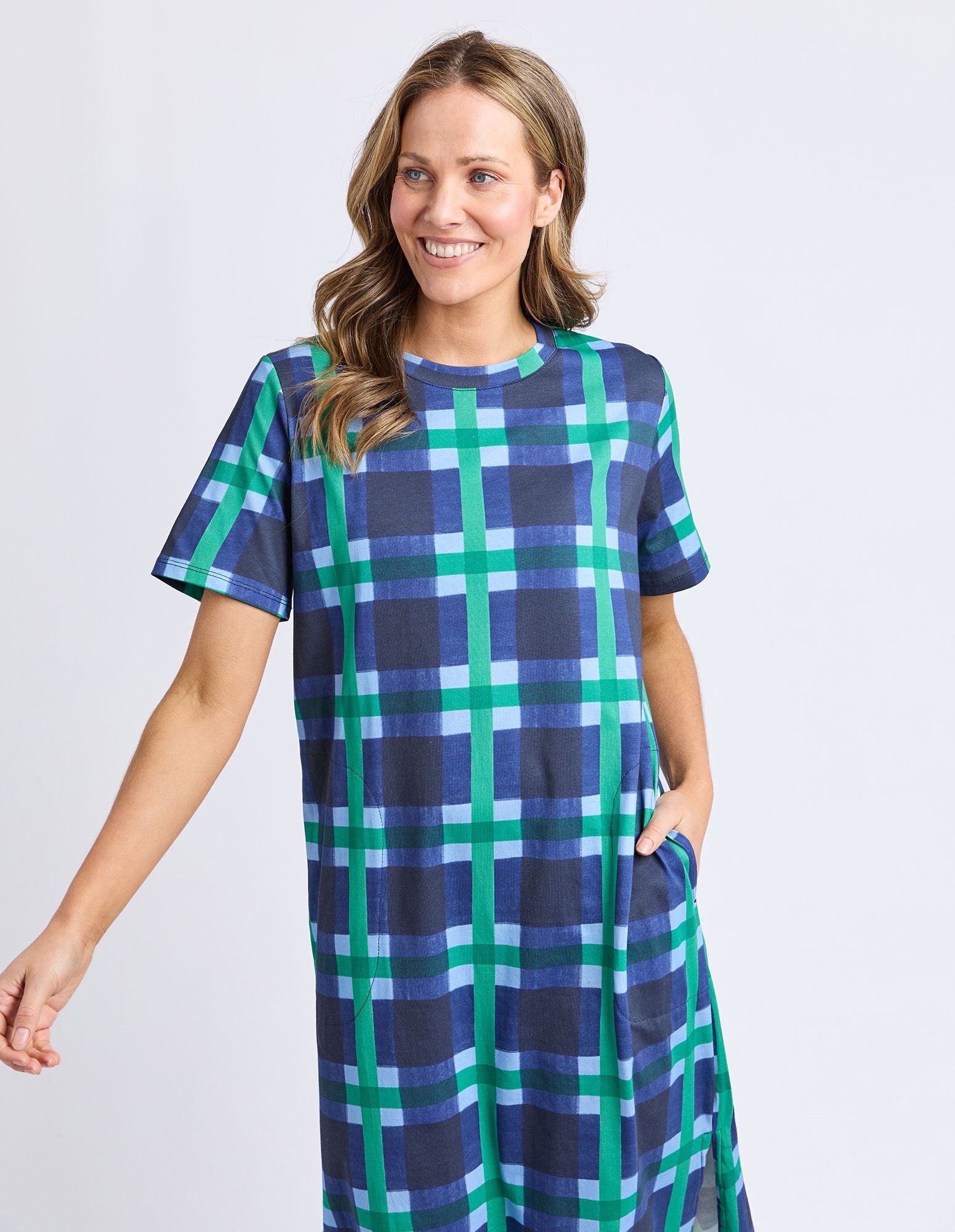 The Bari Dress in Bari Print in gorgeous blue and green checkered print with a round neckline, in a classic shift style, midi length with side splits at the hemline.