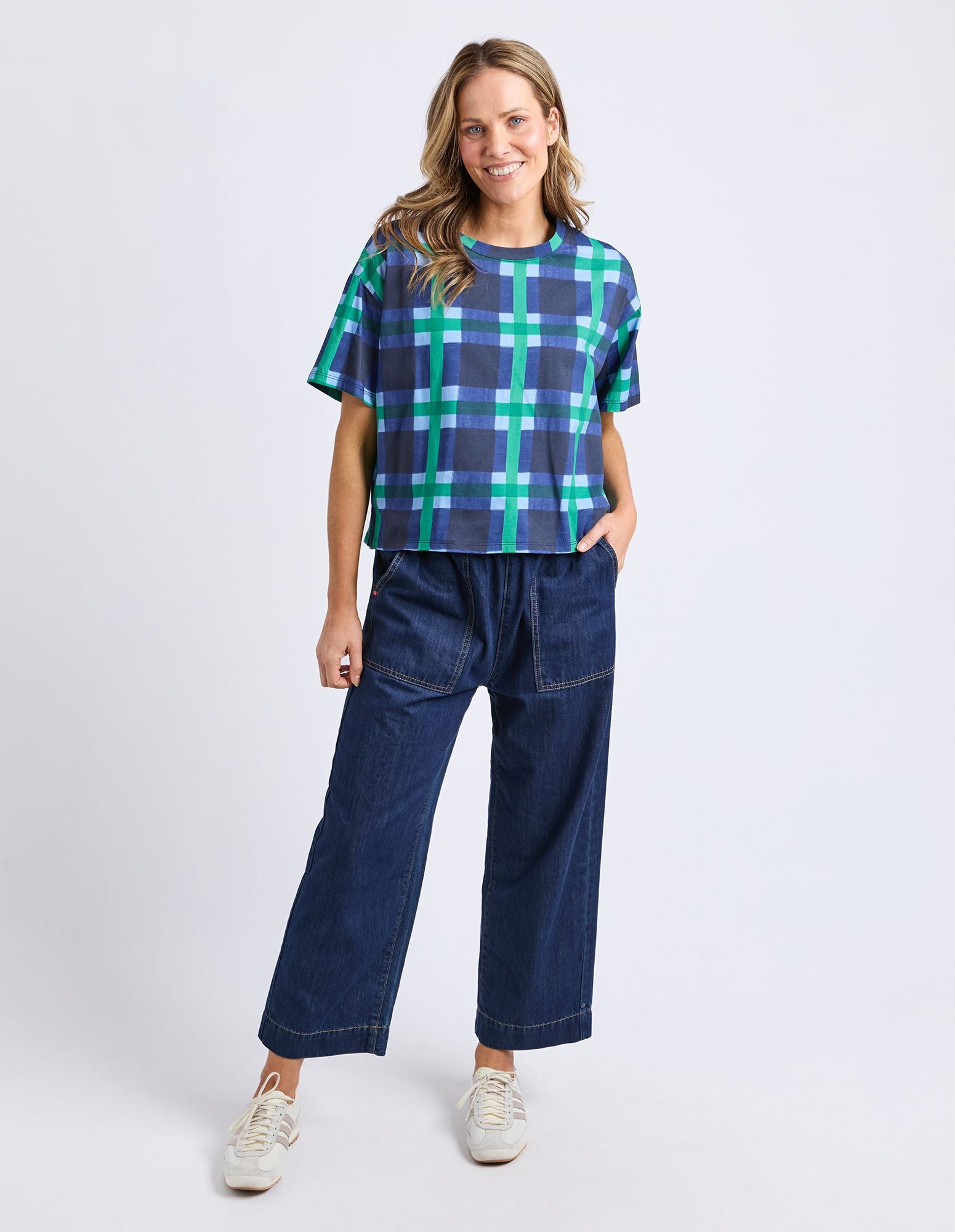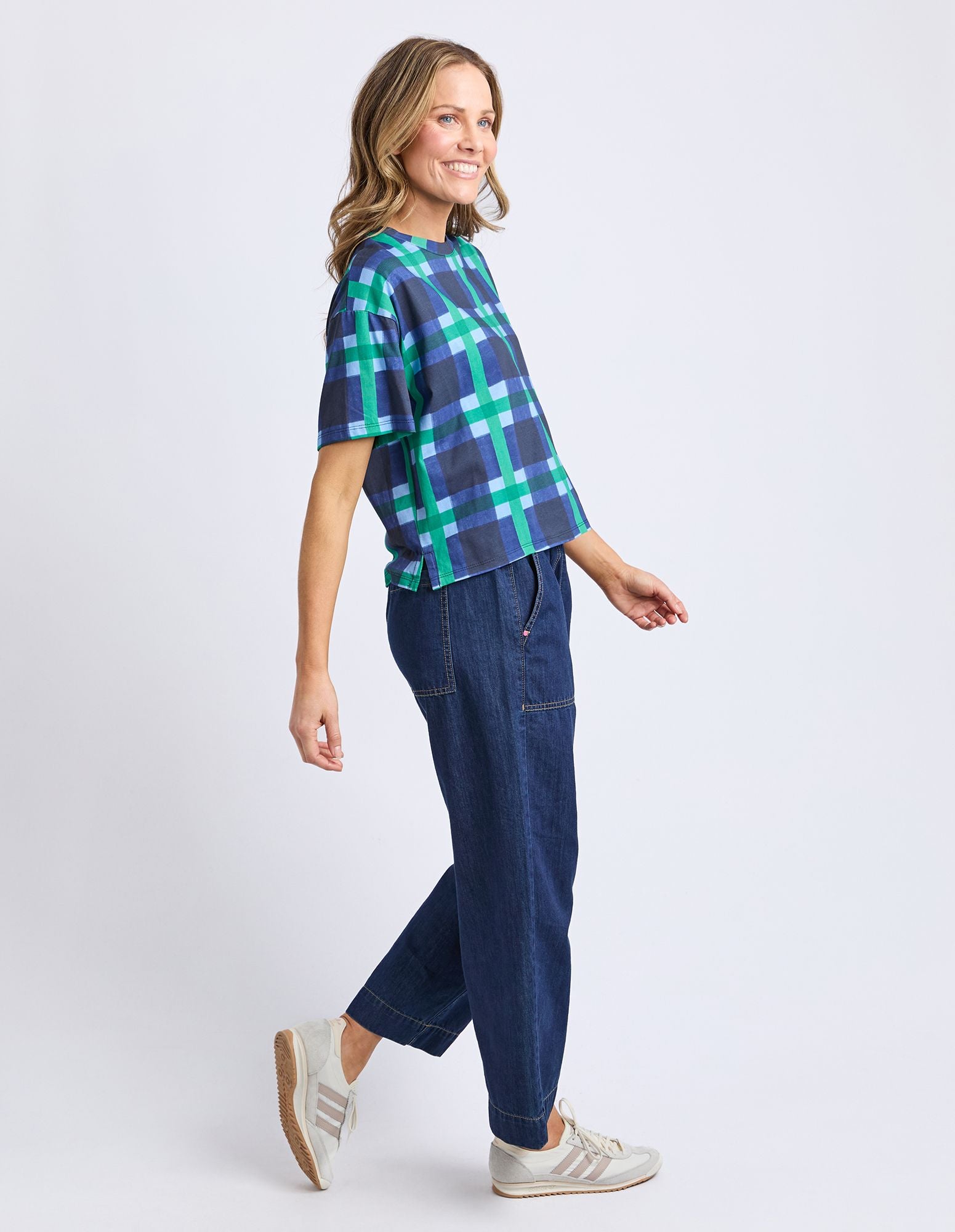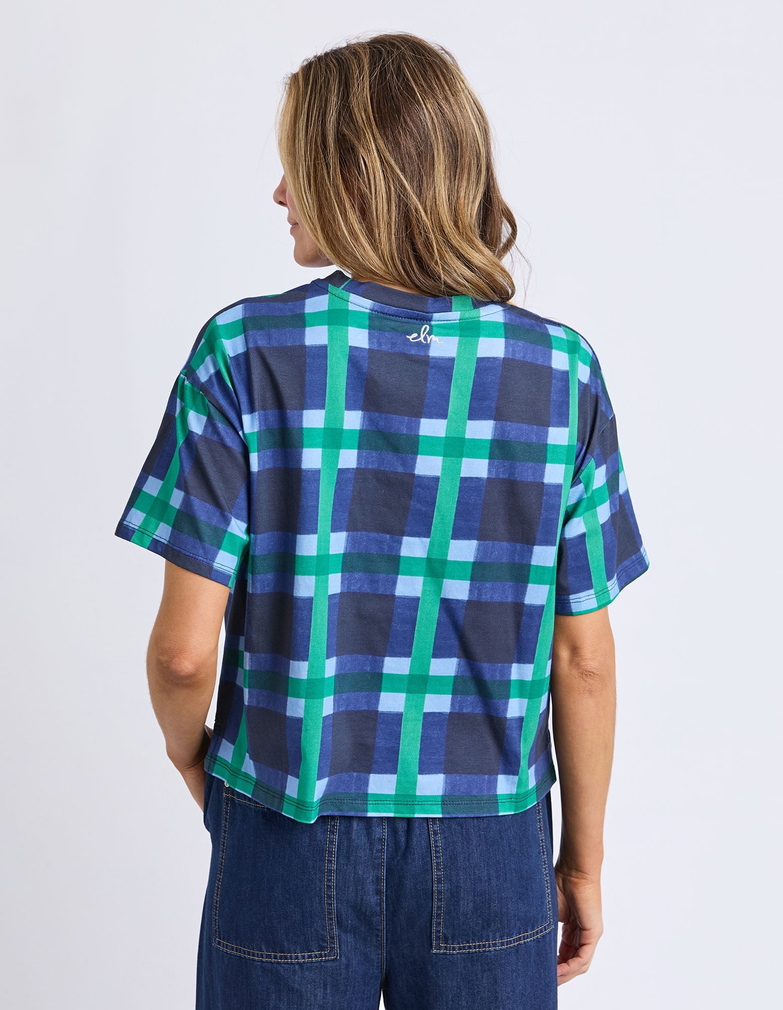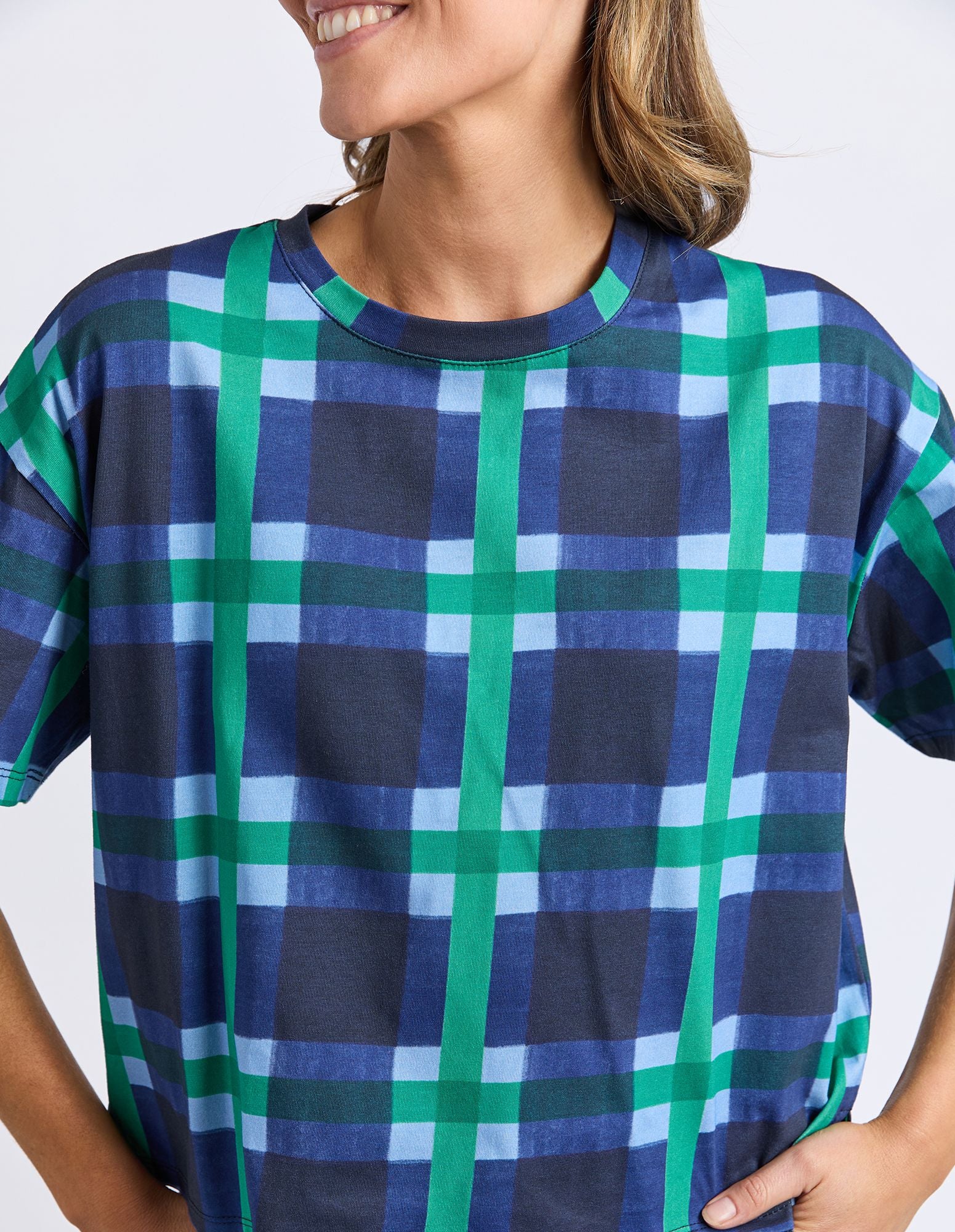 The Bari Tee featuring in Bari Print in gorgeous blue and green checkered print with a round neckline, in a relaxed fitting sitting on the hip.