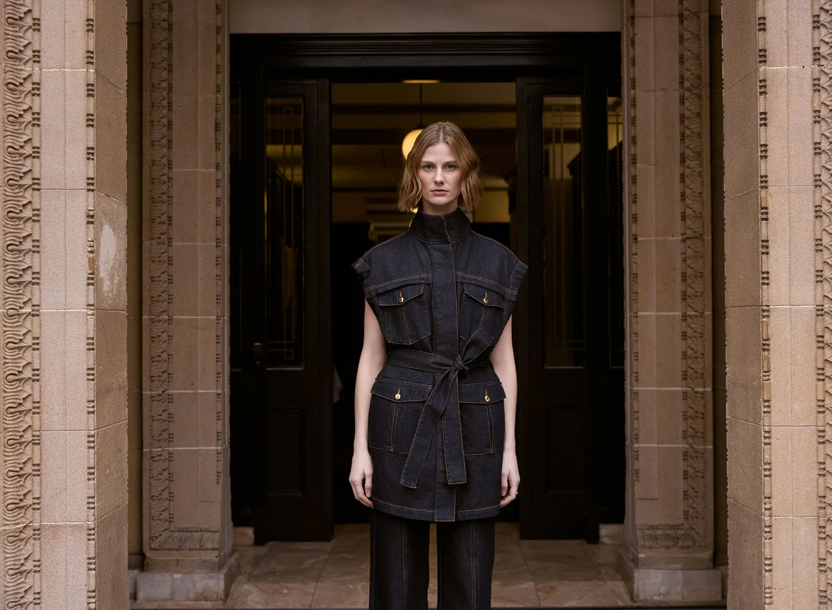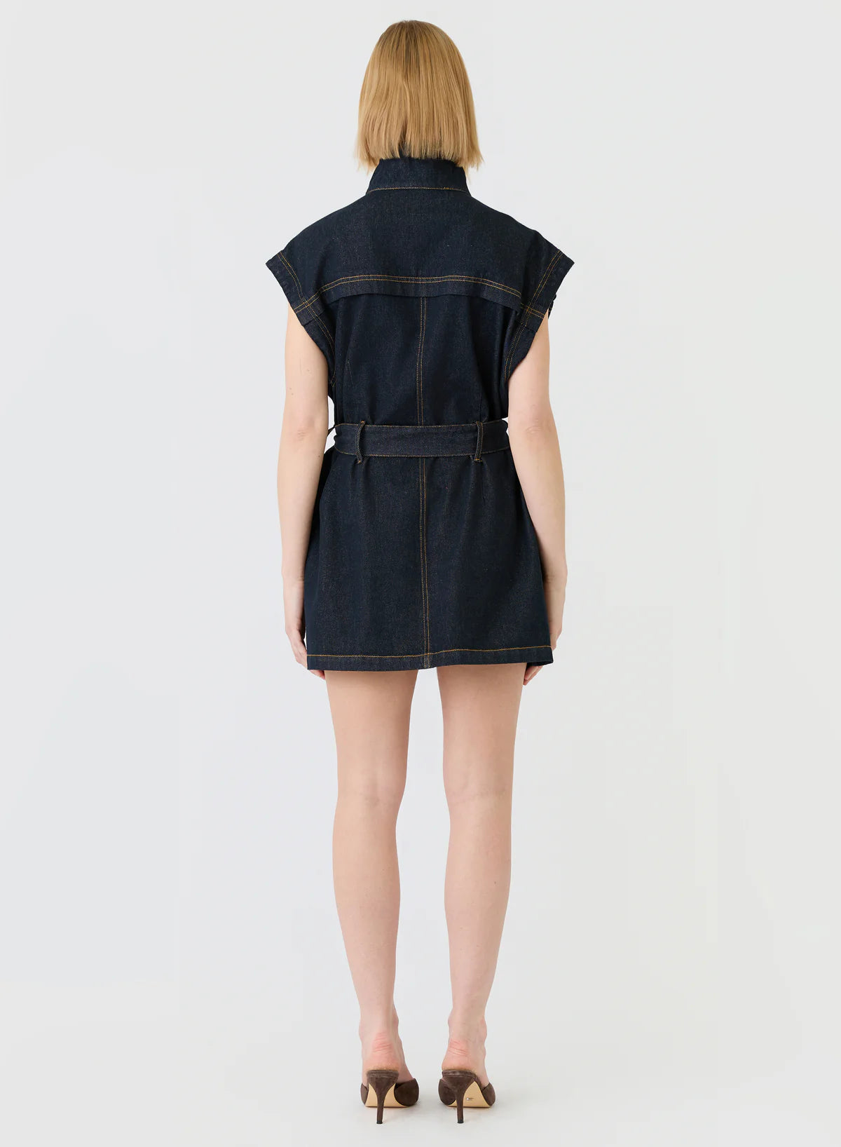 The Franca Denim Dress featuring in Dark Indigo with a collared neckline, functional buttons throughout opening in sleeveless design with functional patch pockets with buttons, a self denim tie belt in a low thigh length.