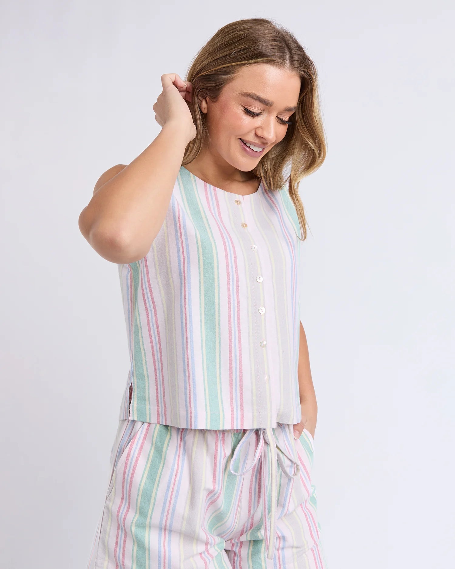 The Cali Top featuring in Multi coloured yarn dyed stripe with a round neckline with front button opening throughout the front, sleeveless.