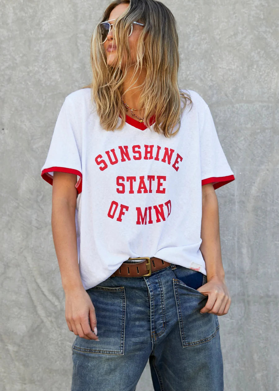 The Sunshine State of Mind tee featuring in a white jersey with red contrast rib on the V-neck and cuffs with a Red SUNSHINE STATE OF MIND print on the front, V Neckline in a relaxed fitting.