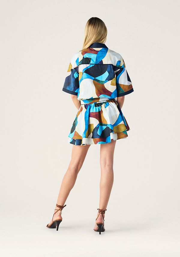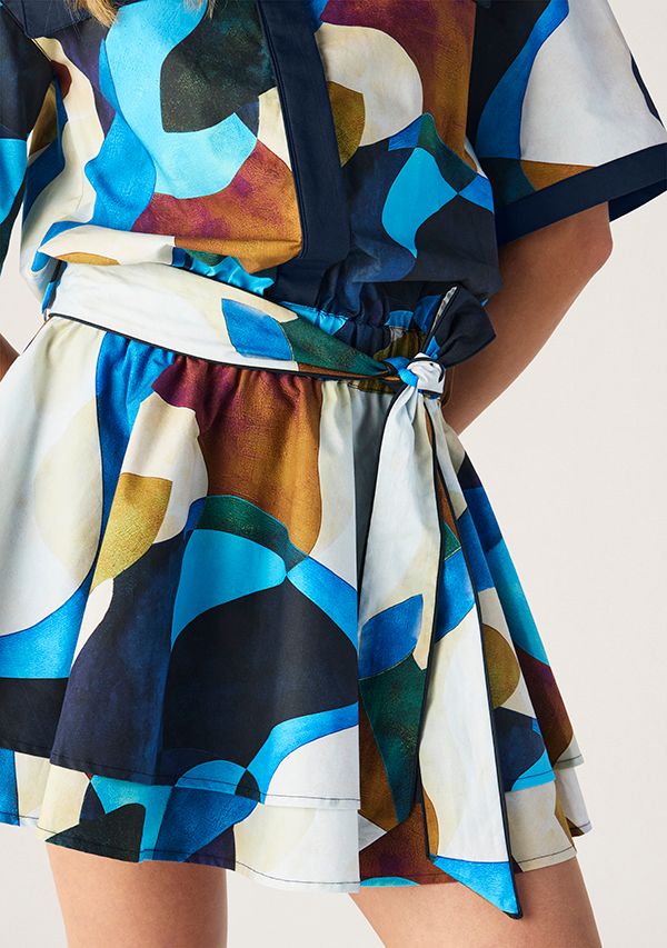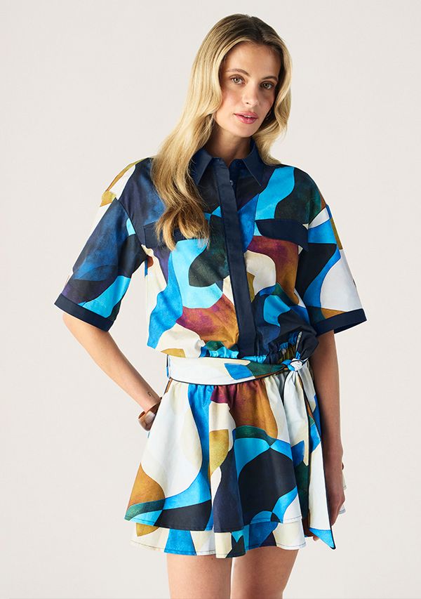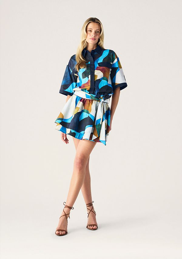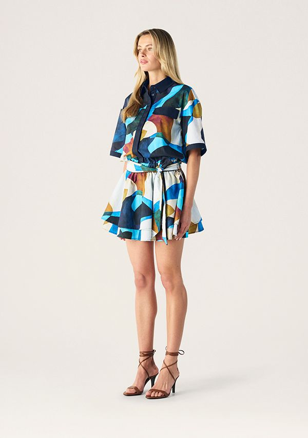 The Celestia Print Ruffle Dress featuring in an abstract print in shades of sapphire, teal, amber and ivory that feels both artistic and contemporary. A stunning relaxed shirt style bodice with short, wide sleeves balancing beautifully with the flared mini skirt, which is cinched at the waist with an elasticated waist with a self-tie belt for that perfect shape making it playful yet polished.