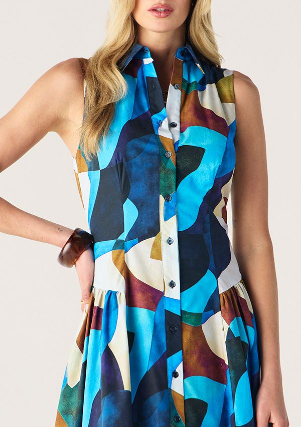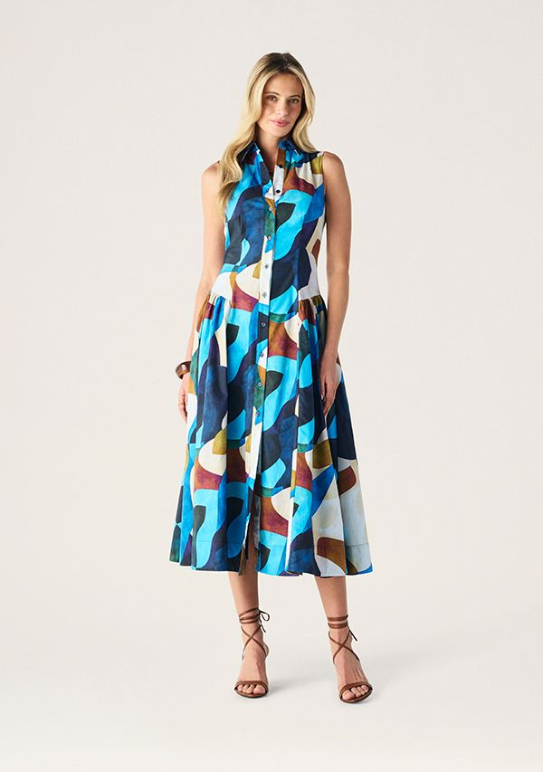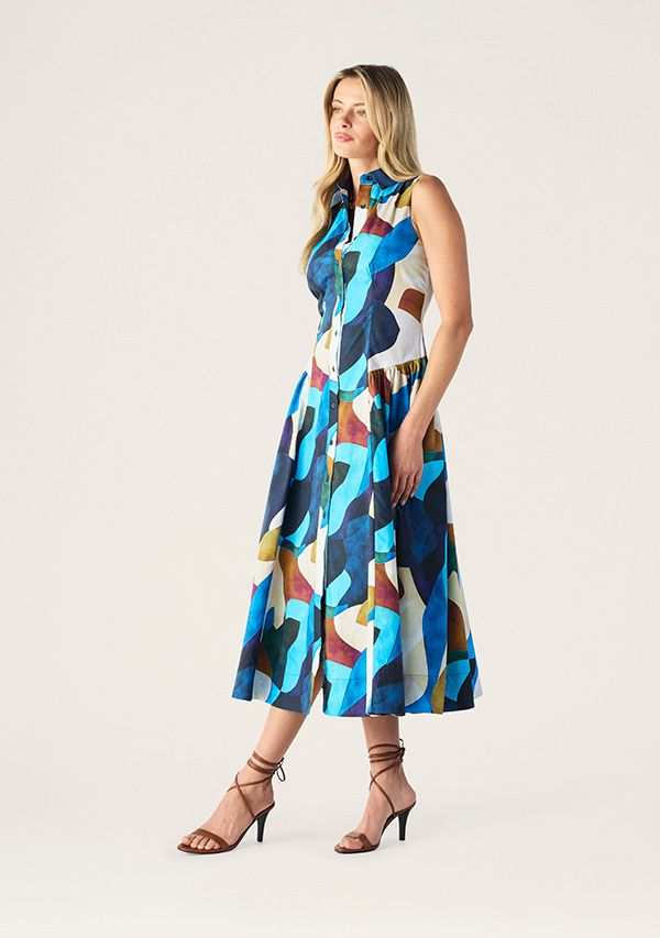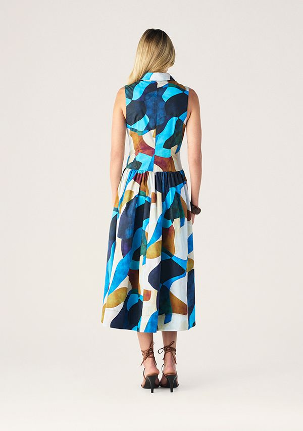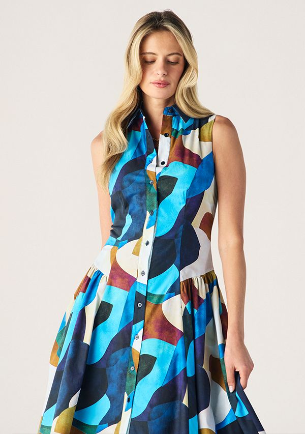 The Celestia Print Sleeveless Midi Dress featuring in the beautifully bold Celestia Print, Cut from a stunningly crisp cotton poplin, a sleeveless silhouette with a collared neckline and full button through front for a polished finish, with its fitted bodice flows into a softly gathered skirt, this vivid abstract print with the timeless shape.